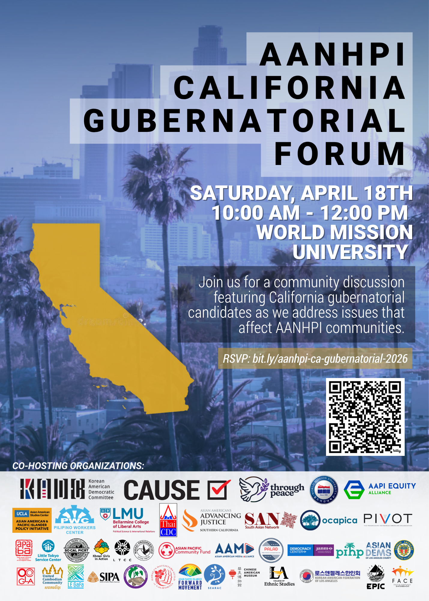 A coalition of leading Asian American, Native Hawaiian, and Pacific Islander (AANHPI) organizations, led by the Korean American Democratic Committee (KADC), Center for Asian Americans United for Self Empowerment (CAUSE), Through Peace, World Mission University and AAPI Equity Alliance will host a California gubernatorial candidate forum on April 18. As the only forum hosted by AANHPI organizations for AANHPI communities in Los Angeles County – this event will offer Democratic and Republican gubernatorial candidates a unique opportunity to engage directly with AANHPI communities, share their vision for the state, and outline how they will support AANHPI priorities as Governor.